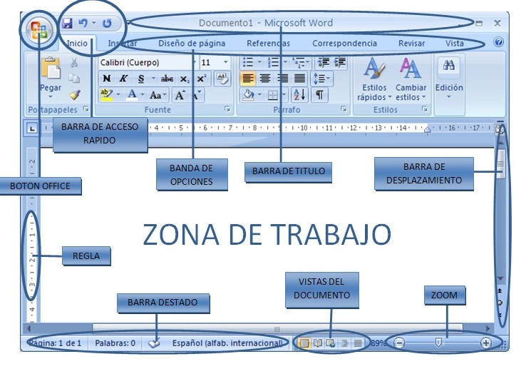 BARRA DE OPCIONES, BARRA DE ACCESO RAPIDO, BARRA DE TITULO, BARRA DE DESPLAZAMIENTO, BOTON OFFICE, REGLA, BARRA DE ESTADO, VISTAS DEL DOCUMENTO, ZOOM.
